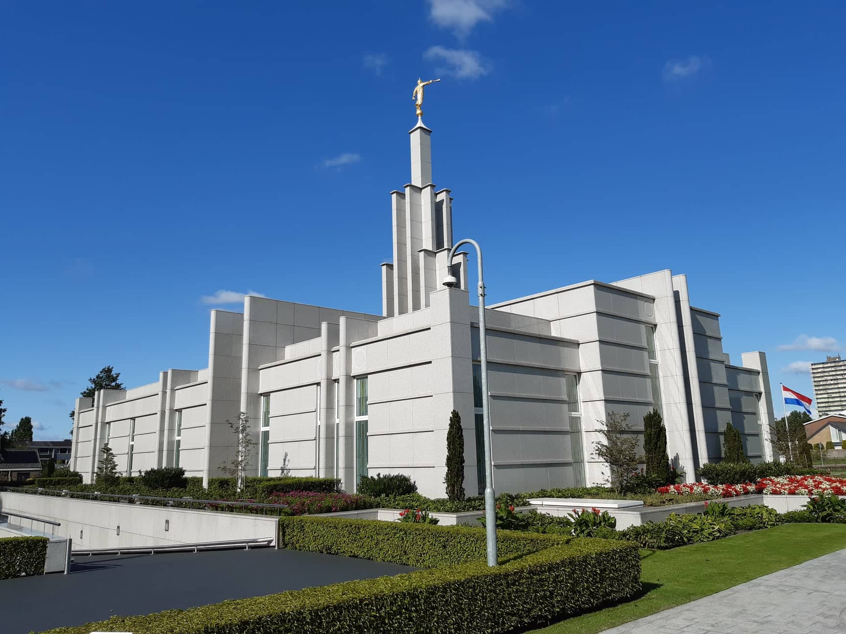 Gisteren ging ik op zoek naar de Heer, waar anders dan in Zoetermeer? De Heer was er niet, of het beliefde hem geen sjoege te geven. Wel was er de engel Moroni, met zijn bazuin. De engel wiens naamgevers ooit ofwel de letter i aan zijn naam toevoegden, ofwel de c eruit weglieten, om te verdonkeremanen hoe het er met zijn geestesgesteldheid voor staat. De "Kerk van Jezus Christus van de Heiligen der Laatste Dagen", wordt het gebedshuis genoemd waarop Moroni prijkt. Laatste dagen, laatste dagen, tuttuttut. Ik vind het nogal een apocalyptische voorstellingen van zaken. Na Alfa, Bravo, Charlie en Delta moeten Echo en Foxtrot en de rest van het reutemeteut-virus nog volgen. Dan gaan we op zijn vroegst eens over laatste dagen spreken. Het leek erop dat de terreinknecht van het Feyenoord-stadion is getransfereerd naar voornoemde kerk. De laatste dagen mogen dan kennelijk aanstaande zijn, in de tuin ligt een biljartlaken.